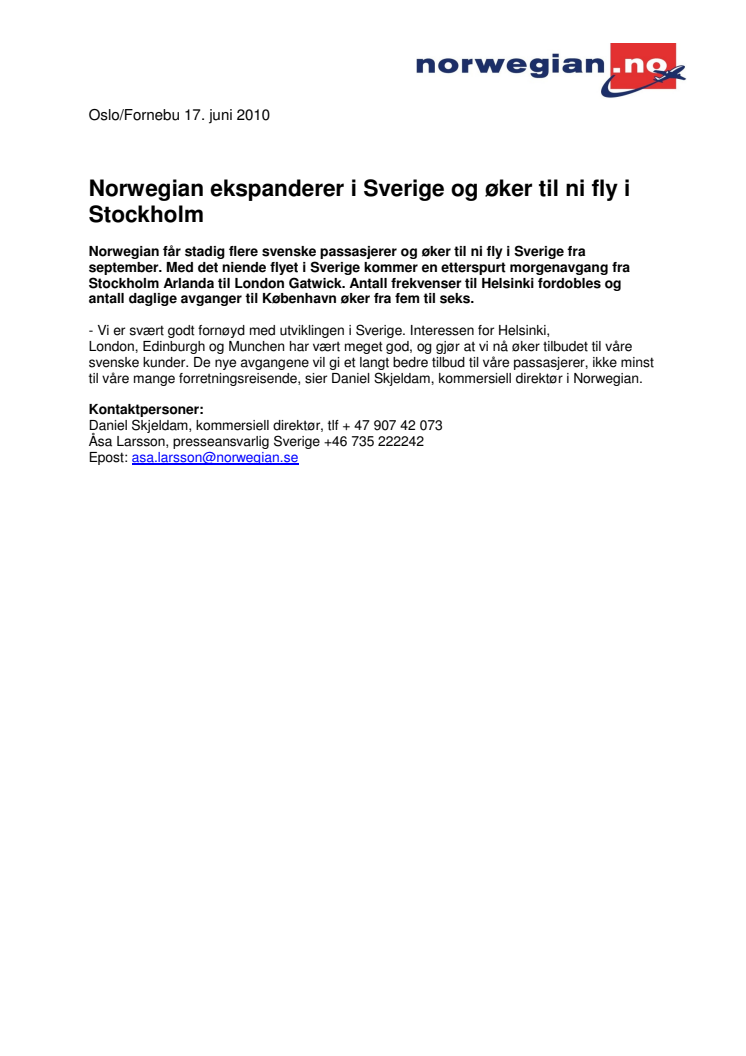 Norwegian får stadig flere svenske passasjerer og øker til ni fly i Sverige fra september. Med det niende flyet i Sverige kommer en etterspurt morgenavgang fra Stockholm Arlanda til London Gatwick. Antall frekvenser til Helsinki fordobles og antall daglige avganger til København øker fra fem til seks.