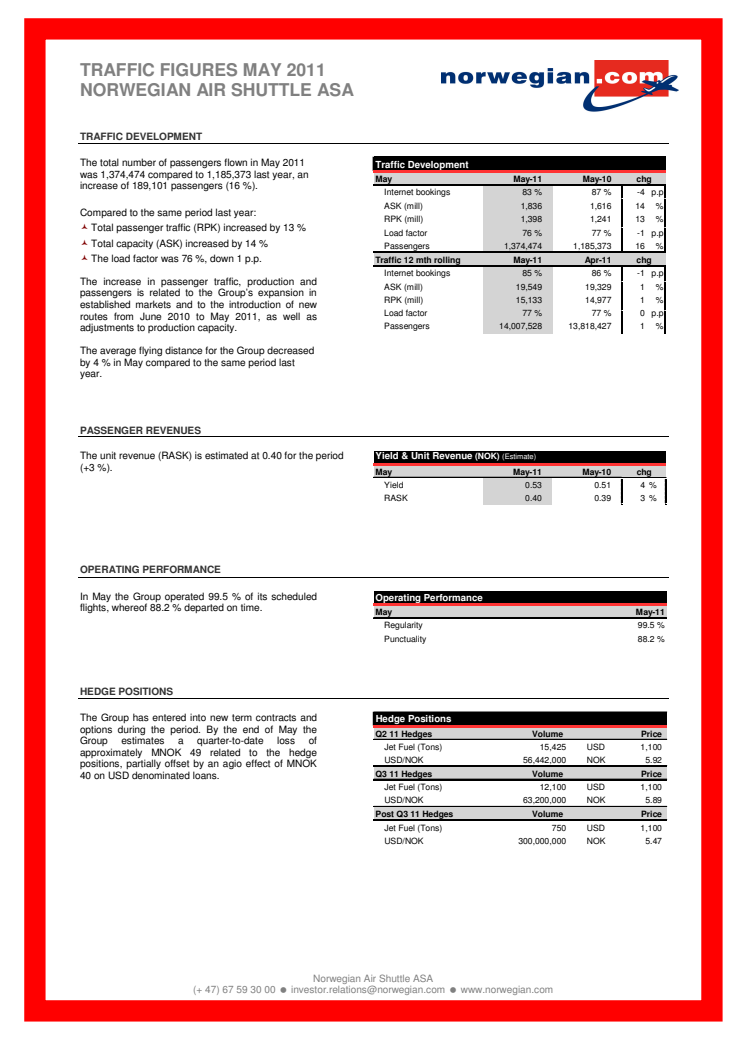 Norwegian hadde en punktlighet i Norge på vel 93 prosent og en regularitet på vel 99 prosent i mai. Måneden er også preget av en sterk passasjervekst for selskapet. I mai måned fløy tett på 1,4 millioner med selskapet – en passasjervekst på 16 prosent. Det siste året har vel 14 millioner passasjerer reist med Norwegian.
