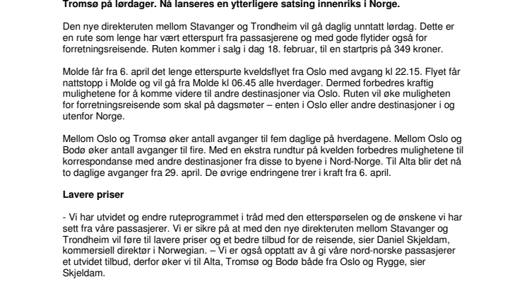 • Norwegian med 48 nye avganger i uken - ny direkterute Stavanger - Trondheim