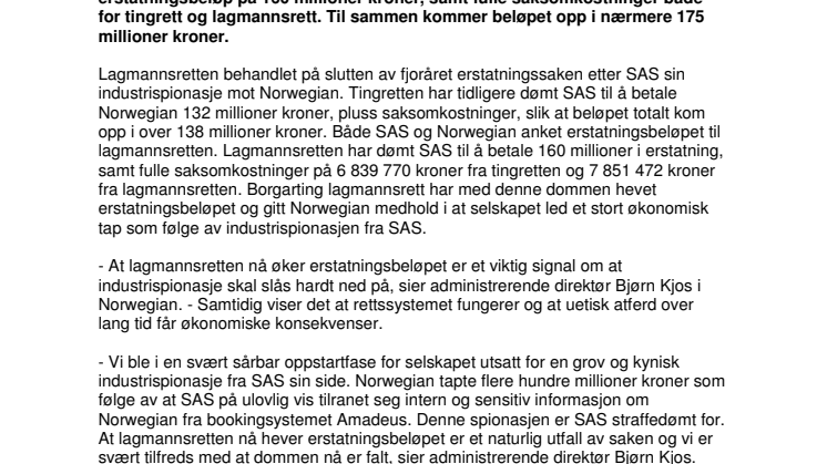 • SAS må betale Norwegian nærmere 175 millioner kroner for industrispionasje