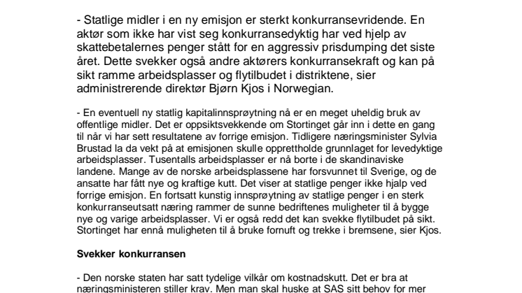 • Den varslede SAS-emisjonen: - Sterkt konkurransevridende – kan på sikt ramme norske arbeidsplasser og flytilbudet i distriktene